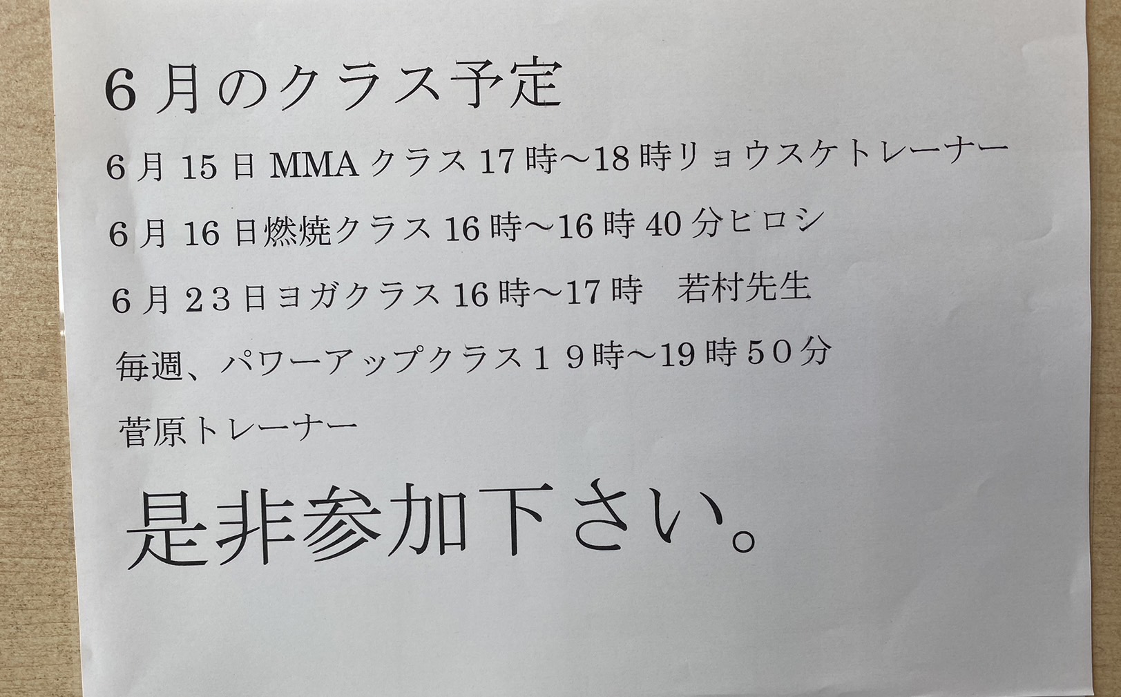 6月15日(土) MMAクラス 17:00~18:00 リョウスケトレーナー 6月16日(日) 燃焼クラス 16:00~16:40 ヒロシトレーナー 6月23日(日) ヨガクラス 16:00~17:00 若村先生 毎週金曜日 パワーアップクラス 19:00~19:50 菅原トレーナー