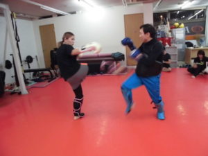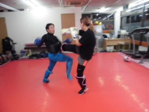 4月14日のアマチュアキックボクシング大会に向けて、気合を入れてトレーニングに励む女子選手(^O^)/ 明るい性格が武器となります(#^^#)