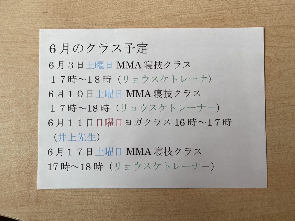 6月3日土曜日MMA寝技クラス17時~18時(リョウスケトレーナ-) 6月10日土曜日MMA寝技クラス17時~18時(リョウスケトレーナ-) 6月11日日曜日ヨガクラス16時~17時(井上先生) 6月17日土曜日MMA寝技クラス17時~18時(リョウスケトレーナ-) 是非参加下さい。