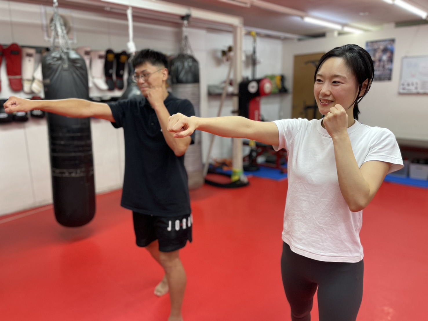 終了後にグローブをつけて基本動作の確認を行い、サンドバッグ打ち。